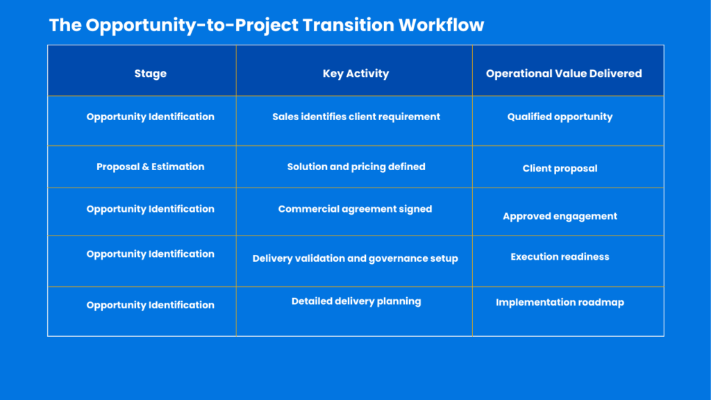 In IT and ITES organizations, this transition sits at a critical point within the Opportunity-to-Cash (O2C) lifecycle. Sales teams secure opportunities and develop proposals. Delivery teams are then responsible for executing those commitments.