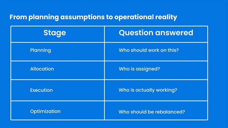 Resource planning in project management focuses on intent. It answers questions such as who should be assigned, when work is expected to start, and how capacity is expected to align with project timelines. Planning happens before execution. It relies on assumptions, estimates, and historical patterns.