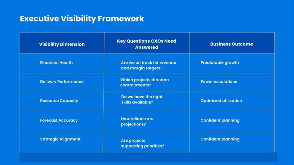 - Executives need decision-grade visibility across financials, delivery performance, resources, and forecasts—not fragmented operational reports.