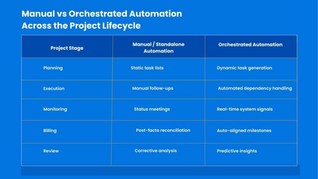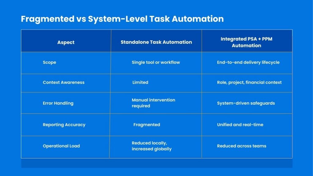- Standalone task automation tools solve isolated problems but create supervision overhead by ignoring delivery, resource, and financial context