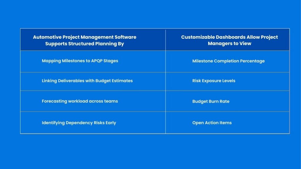 - Automotive Project Management Software centralizes planning, compliance, budgeting, and execution within one integrated management system.