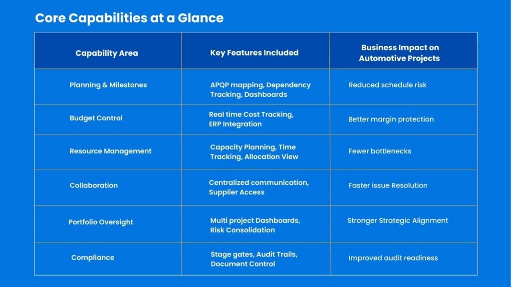 This is where Automotive Project Management Software becomes critical. It creates structure, clarity, and control. It connects people, data, and decisions in real time. It replaces fragmented management tools with one integrated management system designed for automotive complexity.